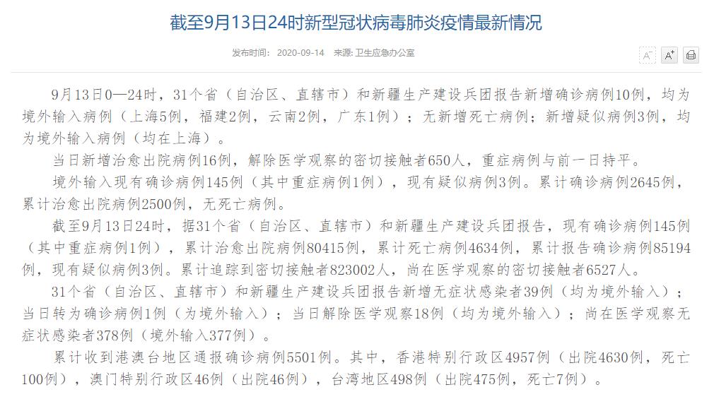 情況顯示,截至9月13日24時(shí),據(jù)31個(gè)?。ㄗ灾螀^(qū)、直轄市)和新疆生產(chǎn)建設(shè)兵團(tuán)報(bào)告,現(xiàn)有確診病例145例(其中重癥病例1例),累計(jì)治愈出院病例80415例,累計(jì)死亡病例4634例,累計(jì)報(bào)告確診病例85194例,現(xiàn)有疑似病例3例。累計(jì)追蹤到密切接觸者823002人,尚在醫(yī)學(xué)觀察的密切接觸者6527人。