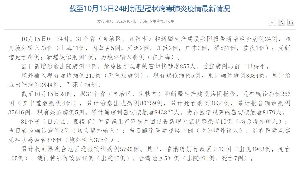 人民網(wǎng)北京10月16日電(董童)國家衛(wèi)生健康委于今日在官網(wǎng)發(fā)布的《截至10月15日24時新型冠狀病毒肺炎疫情最新情況》(以下簡稱“情況”)提出,10月15日0—24時,31個省(自治區(qū)、直轄市)和新疆生產(chǎn)建設兵團報告新增確診病例24例,均為境外輸入病例(上海11例,內(nèi)蒙古5例,天津2例,江蘇2例,廣東2例,福建1例,重慶1例);無新增死亡病例;新增疑似病例1例,為境外輸入病例(在上海)。當日新增治愈出院病例11例,解除醫(yī)學觀察的密切接觸者855人,重癥病例與前一日持平。