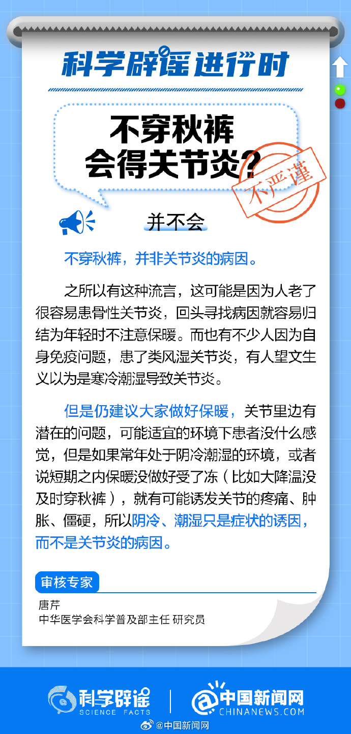 中新網(wǎng)12月11日電 不穿秋褲,并非關(guān)節(jié)炎的病因。之所以有這種流言,這可能是因為人老了很容易患骨性關(guān)節(jié)炎,回頭尋找病因就容易歸結(jié)為年輕時不注意保暖。而也有不少人因為自身免疫問題,患了類風(fēng)濕關(guān)節(jié)炎,有人望文生義以為是寒冷潮濕導(dǎo)致關(guān)節(jié)炎。但陰冷、潮濕是疼痛、僵硬等關(guān)節(jié)炎癥狀的誘因(而不是病因),仍建議大家做好保暖。(來源:@科學(xué)辟謠 @中國新聞網(wǎng))