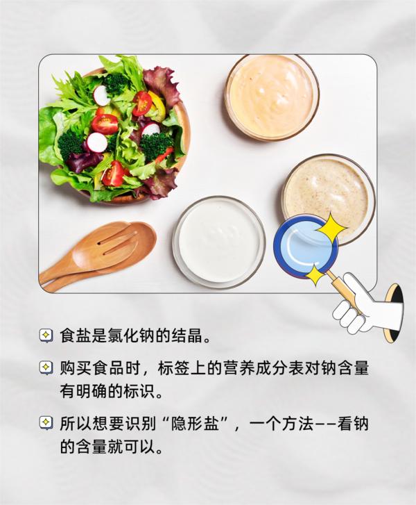 日常飲食要控鹽。有些食品嘗起來(lái)并不咸,但含鹽量卻相當(dāng)高,因?yàn)楹胁簧佟半[形鹽”。食鹽是氯化鈉的結(jié)晶,購(gòu)買食品時(shí),標(biāo)簽上的營(yíng)養(yǎng)成分表對(duì)鈉含量有明確的標(biāo)識(shí)。所以想要識(shí)別“隱形鹽”,可以看標(biāo)簽上鈉的含量。(來(lái)源:科普中國(guó))