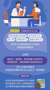 記者從國(guó)家醫(yī)保局了解到,12月1日,全國(guó)醫(yī)保正式上線慢性阻塞性肺疾病、類風(fēng)濕關(guān)節(jié)炎、冠心病、病毒性肝炎、強(qiáng)直性脊柱炎等5種門(mén)診慢特病相關(guān)治療費(fèi)用跨省直接結(jié)算服務(wù)。