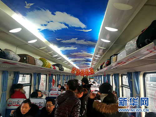 一首《十送紅軍》在車廂里回響,車窗上貼滿“?!弊旨艏?。扶貧火車“蔡家崖”號(hào)21日滿載旅客駛向呂梁山,迎來(lái)開通后的第一個(gè)春運(yùn)。