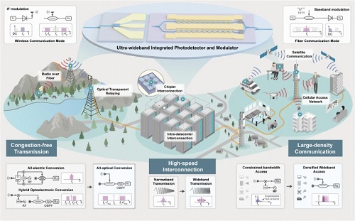 為此,北京大學(xué)聯(lián)合鵬城實驗室、上??萍即髮W(xué)、國家信息光電子創(chuàng)新中心等研發(fā)團隊,創(chuàng)出“光纖—無線一體化融合通信”概念,并采用集成光學(xué)方案,成功研制出250GHz(千兆赫茲)以上超寬帶集成光子器件。在此基礎(chǔ)上開發(fā)出的新系統(tǒng)實現(xiàn)了光纖通信單通道512Gbps(千兆比特每秒)信號傳輸、無線通信單通道400Gbps信號傳輸。
