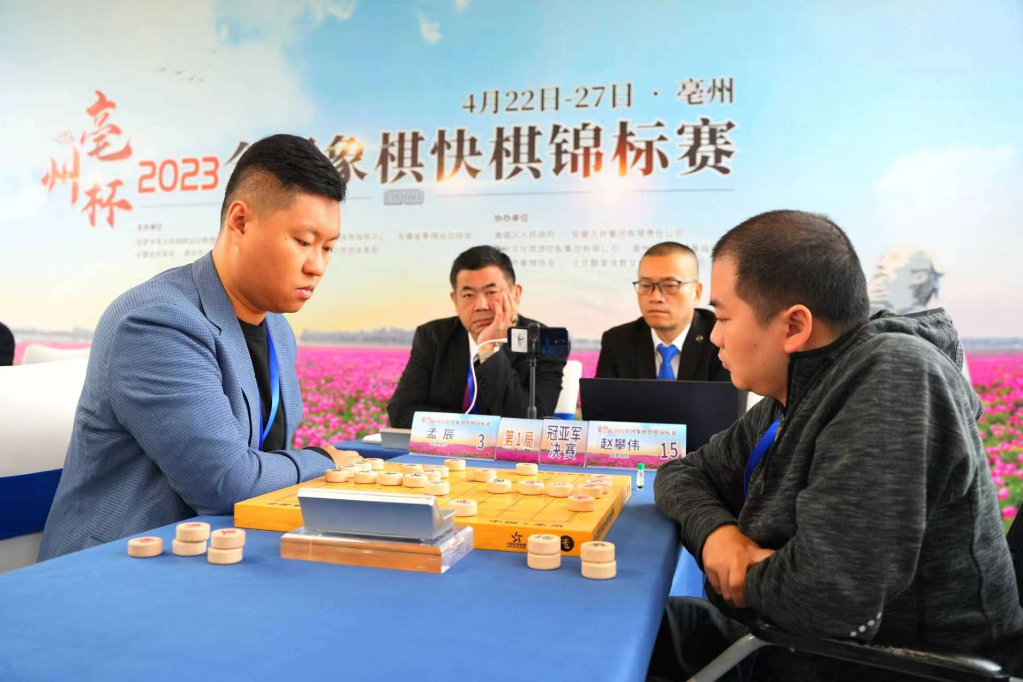 快棋組決賽采用“兩局分先制”,在亳州市華佗百草園景區(qū)進(jìn)行。男子組冠軍爭奪戰(zhàn)第一局由趙攀偉執(zhí)先手,雙方以和棋收場。第二局換先再戰(zhàn),孟辰執(zhí)先手?jǐn)[出“中炮直橫車進(jìn)三兵”開局,趙攀偉應(yīng)以“屏風(fēng)馬進(jìn)三卒”。雙方布局階段便產(chǎn)生激斗,最終孟辰通過步步精準(zhǔn)的進(jìn)攻取得勝利。