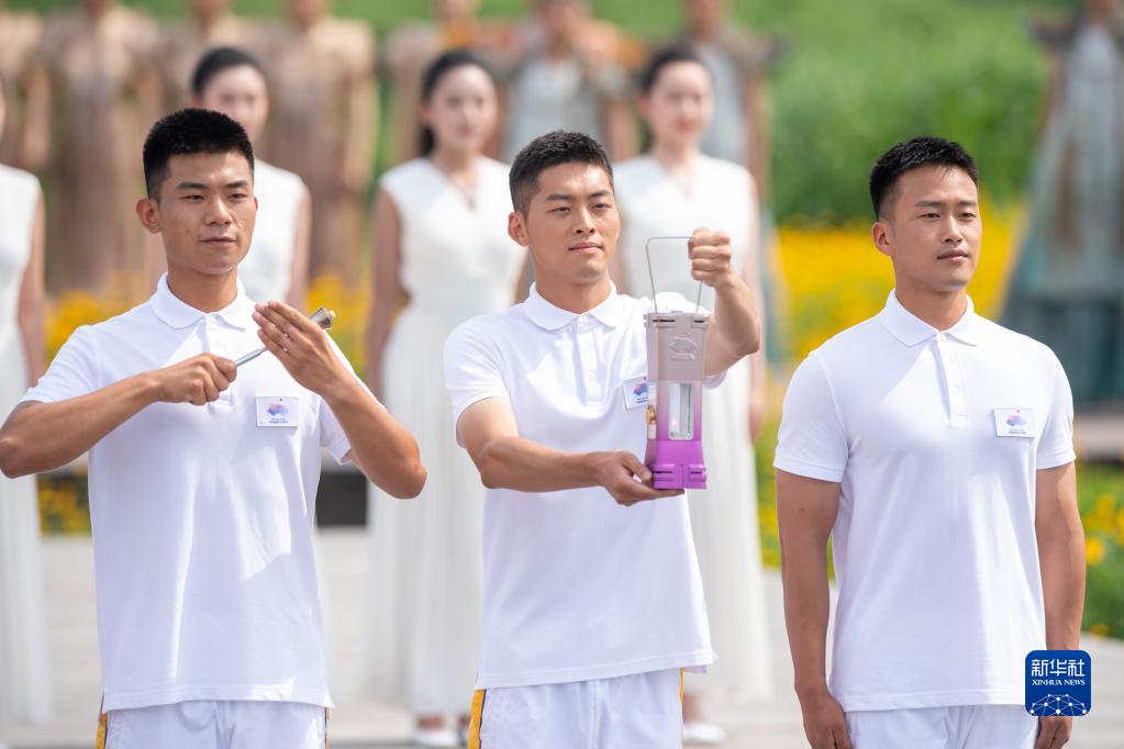 6月15日,火種護(hù)衛(wèi)將圣火引入火種燈并展示。新華社記者 江漢 攝