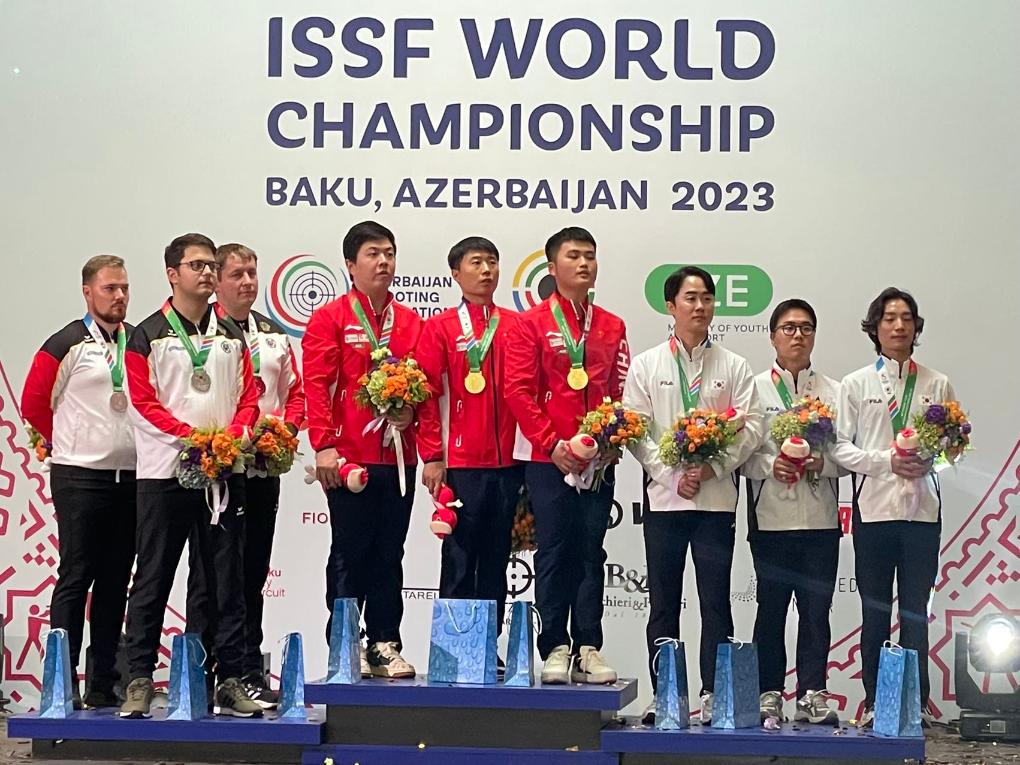 王鑫杰(左四)、李越宏(中)和劉楊攀(右四)在團(tuán)體頒獎(jiǎng)儀式上 該項(xiàng)目比賽中,中國(guó)隊(duì)老將新人都有出色發(fā)揮。首次參加國(guó)際比賽的王鑫杰資格賽打出588環(huán)排名第一,與位居次席的李越宏攜手晉級(jí)決賽。他們兩人與劉楊攀組成的中國(guó)隊(duì)團(tuán)體成績(jī)1756環(huán),追平了世界紀(jì)錄,足足領(lǐng)先亞軍德國(guó)隊(duì)16環(huán)。