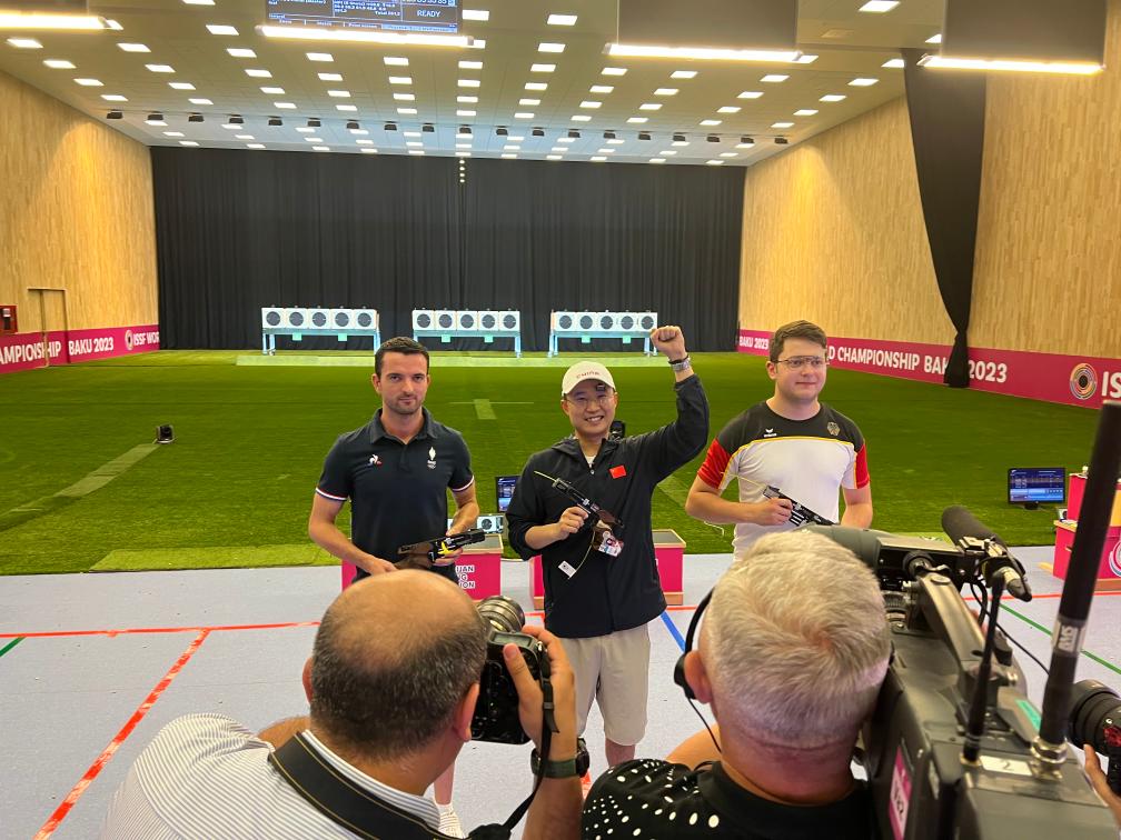 李越宏(中)在決賽后 個(gè)人決賽采用4秒5發(fā)子彈為一組的射擊,每發(fā)命中9.7環(huán)及以上才算中靶。即將迎來(lái)34歲生日的李越宏40發(fā)打出驚人的39中。他在這場(chǎng)比賽中優(yōu)勢(shì)巨大,最后一組的5發(fā)還沒(méi)打就已經(jīng)提前鎖定冠軍,結(jié)果他仍然穩(wěn)穩(wěn)命中最后5發(fā),把韓國(guó)選手保持了5年的世界紀(jì)錄又提升1中,無(wú)限逼近極限。王鑫杰最終名列第五。