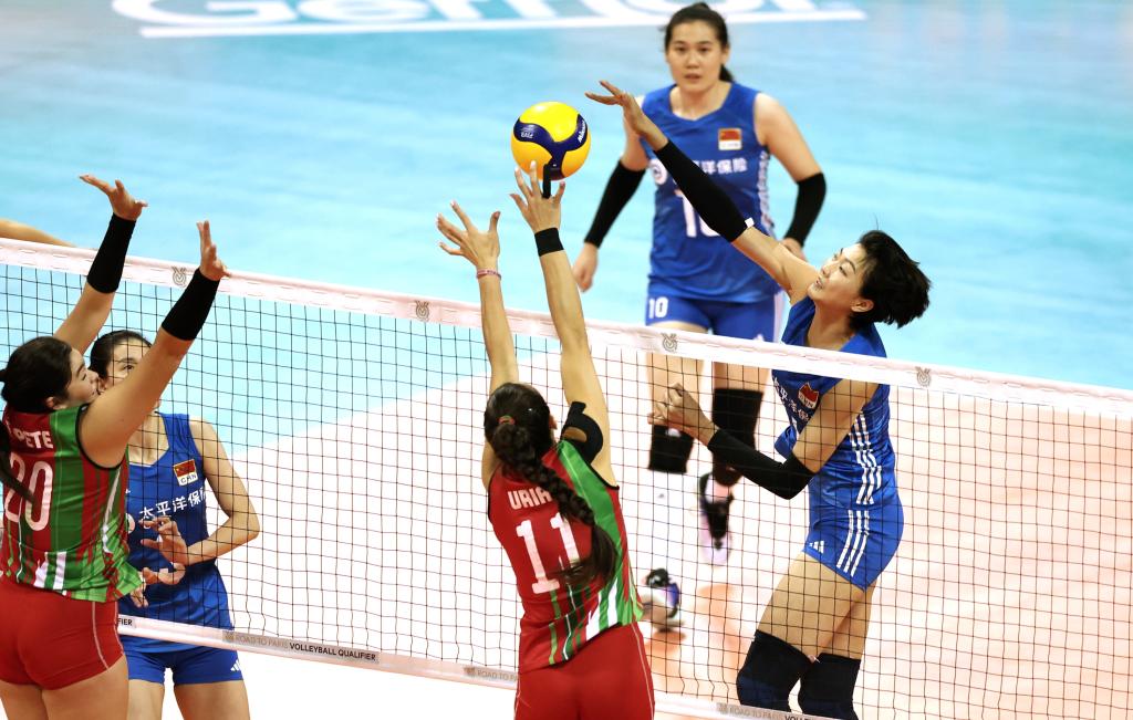 9月17日,中國隊(duì)球員袁心玥(右一)在比賽中扣球。當(dāng)日,在浙江省寧波市舉行的巴黎奧運(yùn)會女排資格賽A組比賽中,中國隊(duì)以3:0戰(zhàn)勝墨西哥隊(duì)。新華社記者 陳斌 攝
