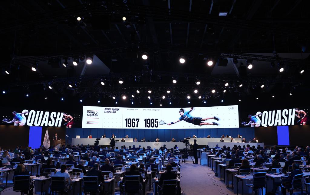 這是10月16日在印度孟買舉行的國際奧委會(huì)第141次全會(huì)現(xiàn)場大屏幕展示的壁球項(xiàng)目。新華社記者 曹燦 攝