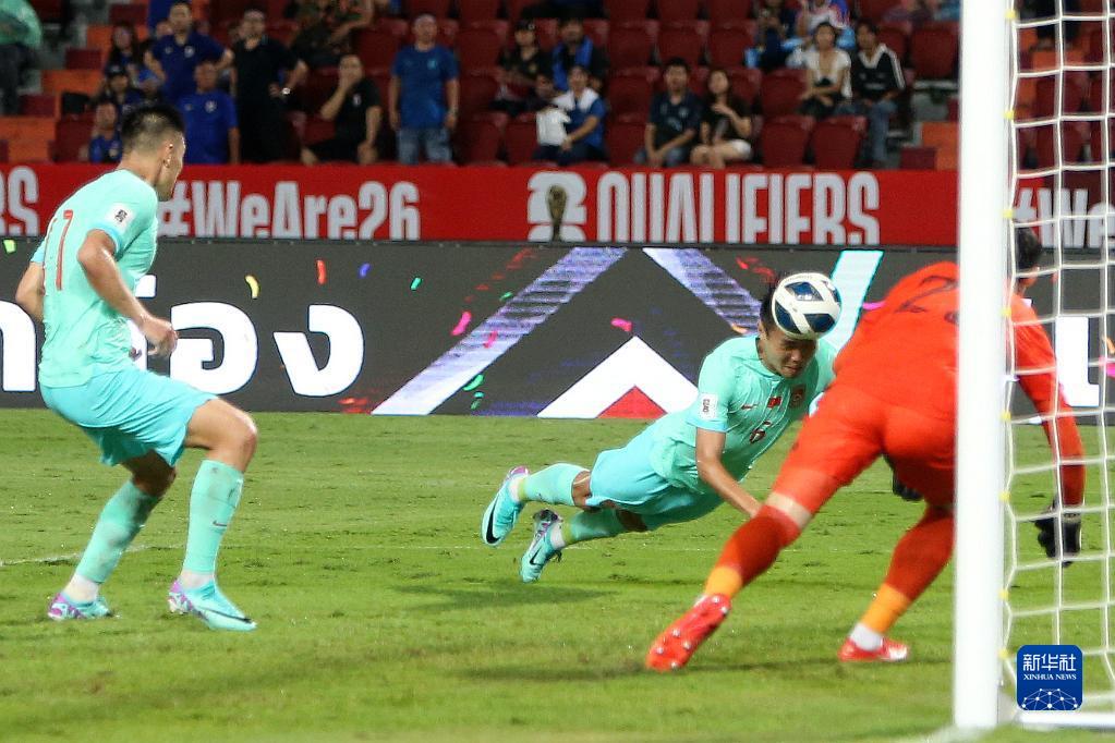 11月16日,中國隊球員王上源(中)在比賽中頭球攻門得分。當(dāng)日,在泰國曼谷舉行的2026世界杯預(yù)選賽亞洲區(qū)36強賽C組比賽中,中國隊以2比1戰(zhàn)勝泰國隊。新華社記者 王騰 攝