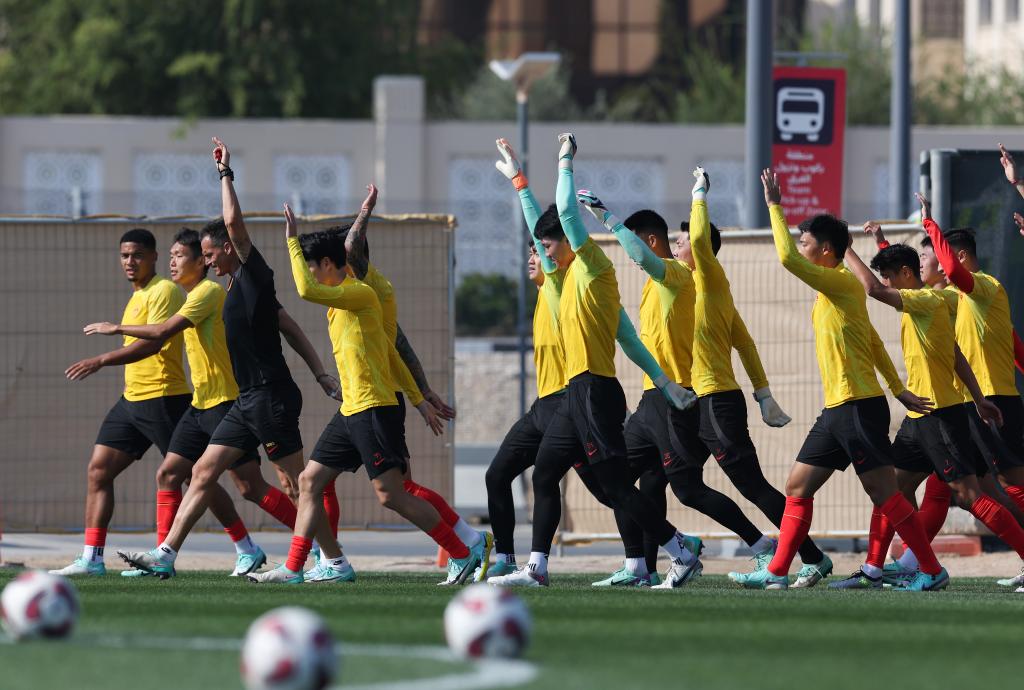 1月11日,中國男足隊員在卡塔爾多哈進行訓練,備戰(zhàn)將于1月12日開賽的卡塔爾男足亞洲杯。新華社記者丁汀攝
