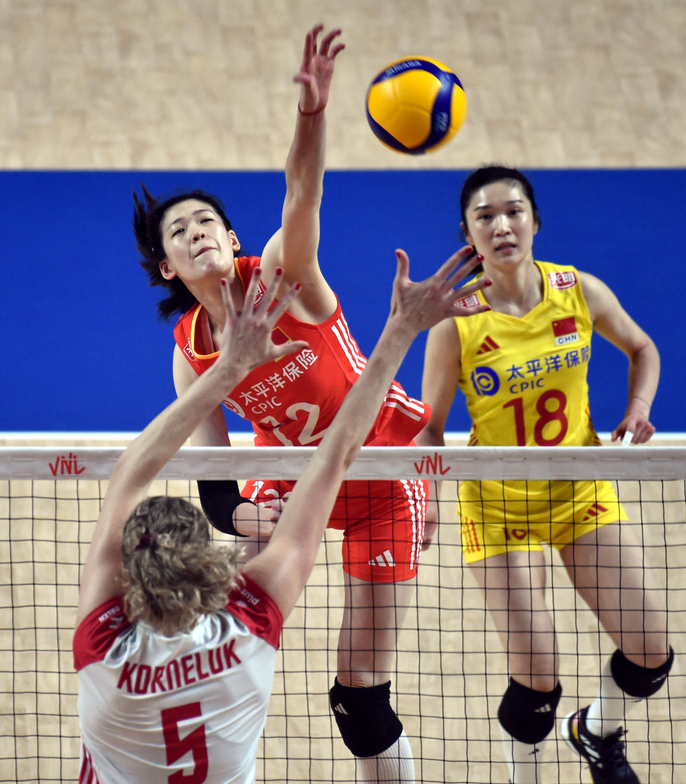 6月16日,中國(guó)隊(duì)球員袁心玥(中)在比賽中吊球。新華社記者 盧炳輝 攝