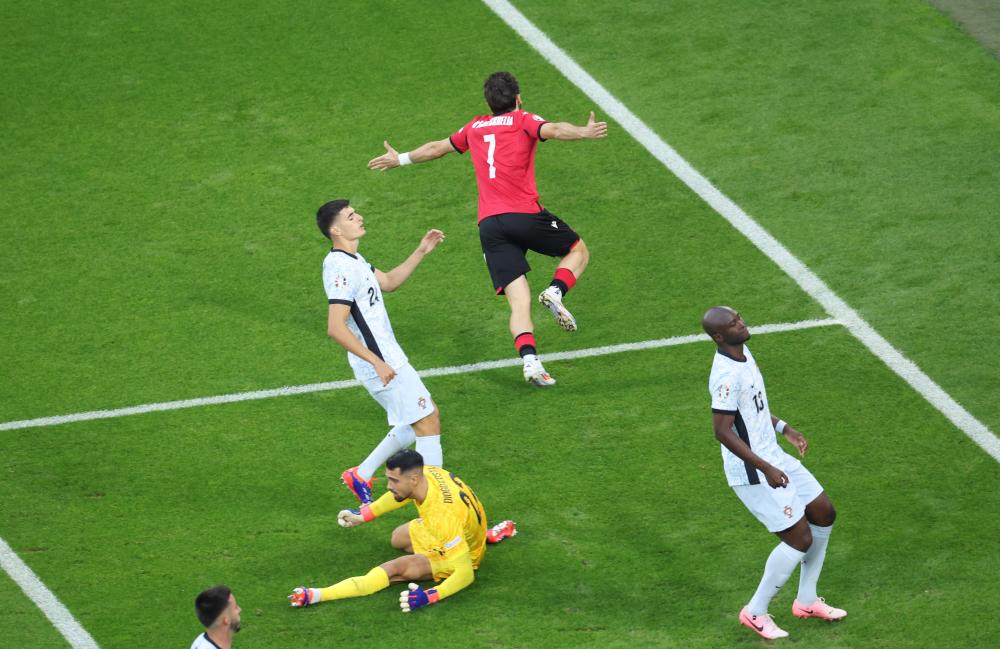 6月26日,格魯吉亞隊球員赫維察·克瓦拉茨赫利亞(上)慶祝進球。新華社記者 白雪飛 攝
