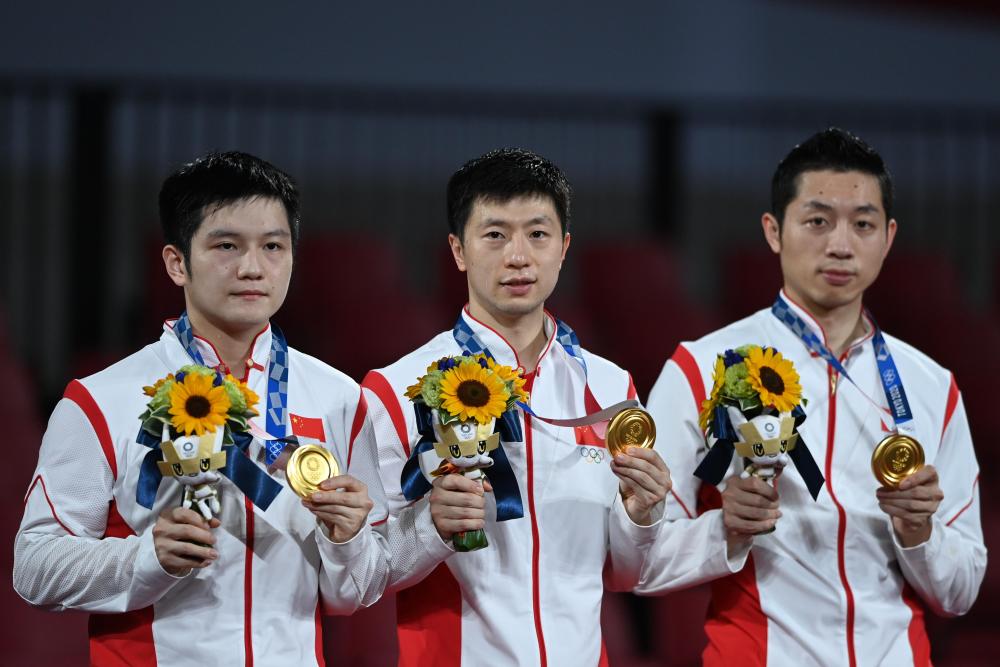 2021年8月6日,中國隊(duì)選手馬龍(中)、許昕(右)、樊振東在頒獎(jiǎng)儀式上。當(dāng)日,在東京奧運(yùn)會(huì)乒乓球男子團(tuán)體決賽中,中國隊(duì)以3:0的總比分戰(zhàn)勝德國隊(duì),奪得冠軍。新華社記者 黃宗治 攝