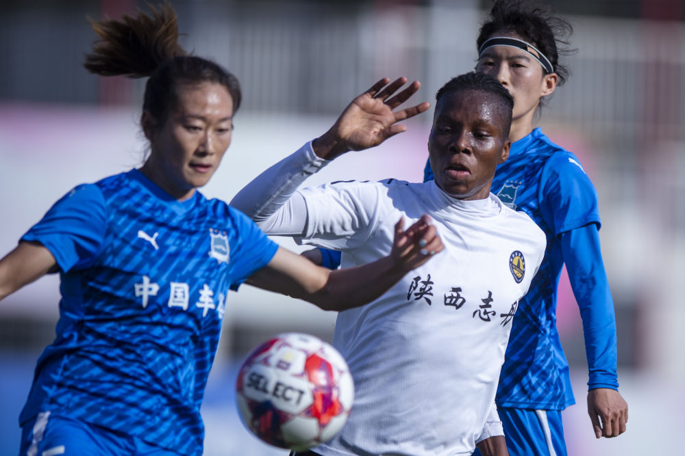 9月28日,陜西志丹隊(duì)球員朱麗葉·伊莫·貝希(中)和武漢車谷江大隊(duì)球員吳海燕(左)在比賽中拼搶。新華社記者 伍志尊 攝