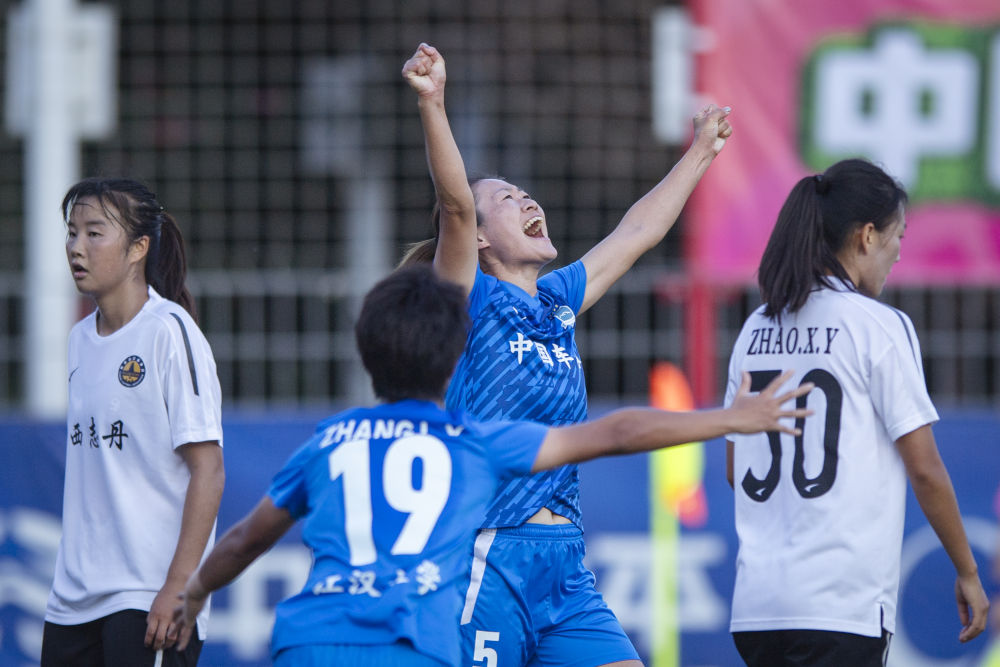 9月28日,武漢車谷江大隊(duì)球員吳海燕(右二)進(jìn)球后慶祝。新華社記者 伍志尊 攝