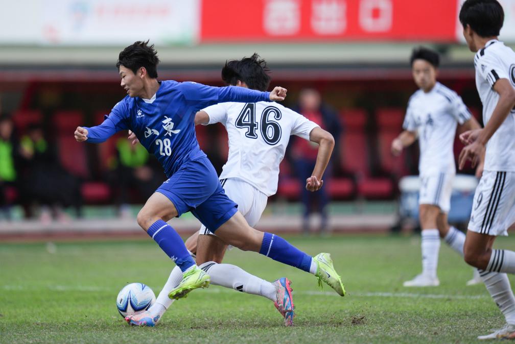 11月27日,山東隊球員陳子涵(左一)在比賽中進(jìn)攻。當(dāng)日,在第一屆青少年三大球運動會足球項目男子金牌賽中,山東隊1:0勝上海隊,奪得冠軍。新華社記者 薛宇舸 攝 “奔跑吧·少年”陽光體育大會 全年舉辦各類活動7.8萬余場 參與青少年超2800萬人次 真正帶動了孩子們“動起來”