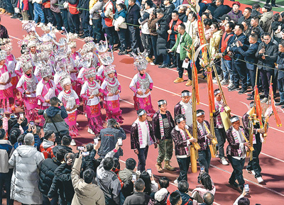1月4日,發(fā)源于貴州省黔東南苗族侗族自治州榕江縣的“村超”正式拉開第三屆賽事的序幕。圖為拉拉隊參加入場巡游。新華社記者 楊文斌攝