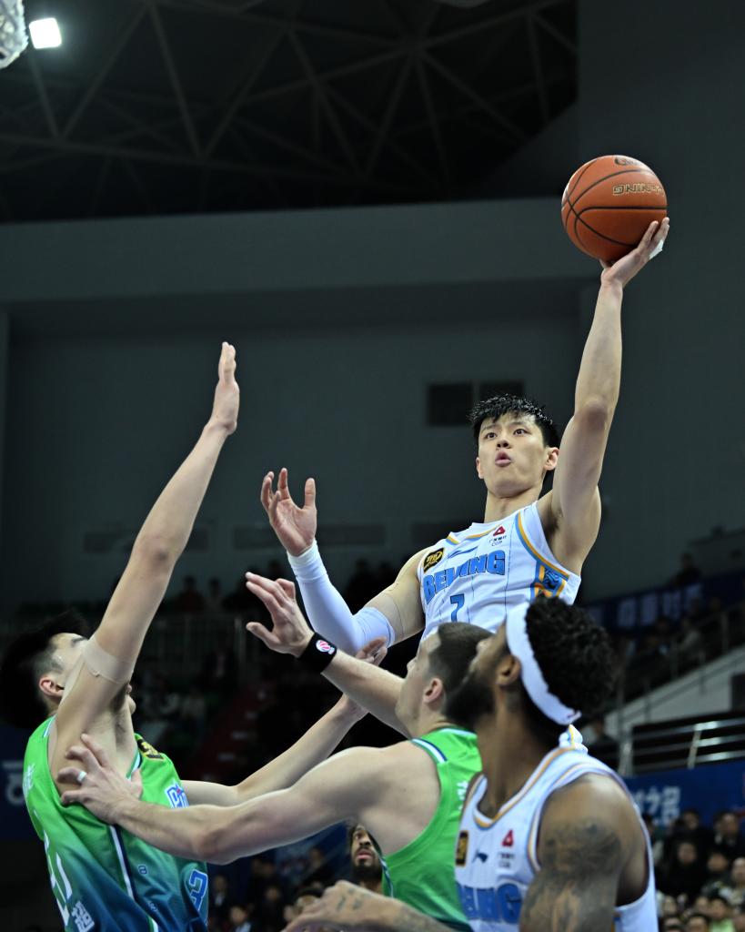 3月31日,北京隊球員曾凡博(上)在比賽中投籃。新華社記者 孫凡越 攝