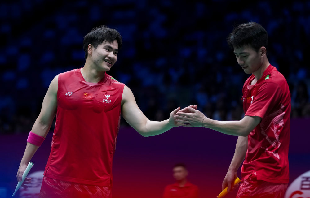 4月28日,中國(guó)隊(duì)組合梁偉鏗(左)/王昶在男雙比賽中慶祝得分。最終,梁偉鏗/王昶2:0戰(zhàn)勝中國(guó)香港隊(duì)組合洪魁駿/呂俊瑋。新華社記者 孫非 攝