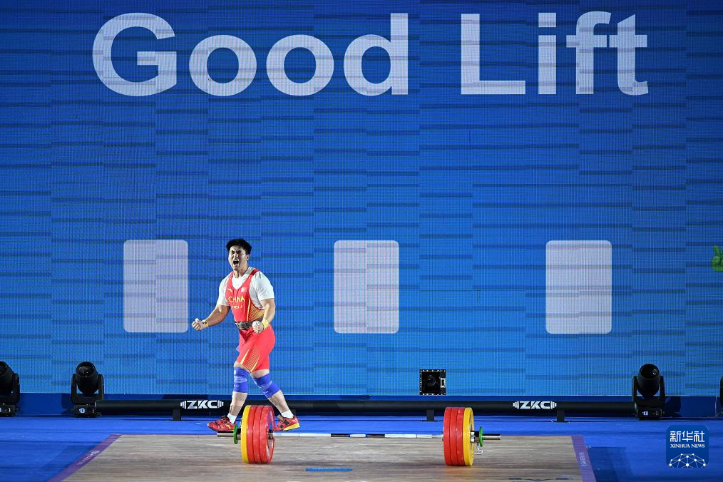 5月13日,中國選手錢飛翔在挺舉比賽中慶祝最后一次試舉成功。最終,他獲得抓舉、挺舉兩項(xiàng)季軍和總成績第四名。新華社記者 侯昭康 攝