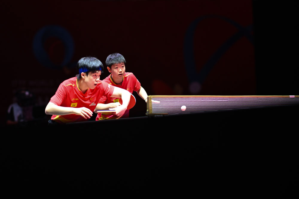 5月18日,王楚欽(左)/孫穎莎在比賽中。新華社記者 肖藝九 攝 男單頭號種子林詩棟首次出戰(zhàn)世乒賽單打項(xiàng)目,首輪迎戰(zhàn)英格蘭選手皮切福特。林詩棟在前兩局與對手陷入纏斗,均以兩分的微弱優(yōu)勢取勝。林詩棟在第三局打出一波小高潮,在5:2領(lǐng)先后連得6分,最終以11:9、12:10、11:2、11:9贏下首秀。