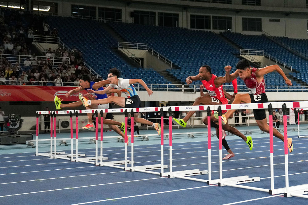 9月7日,日本選手阿部竜希(左一)、中國選手徐卓一(左二)和陳圓將(右一)在男子110米欄比賽中。新華社記者 鞠煥宗 攝