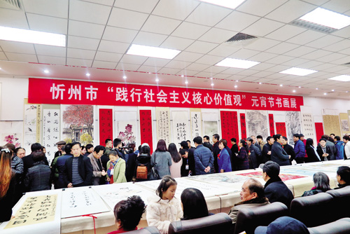 本報(bào)訊2月17日上午,由忻州市委宣傳部主辦、忻州市文聯(lián)和五臺(tái)山書畫院承辦的“忻州市‘踐行社會(huì)主義核心價(jià)值觀’元宵節(jié)書畫展”在五臺(tái)山書畫院開展。市政協(xié)主席張明成,市委常委、宣傳部長陳義青,市政協(xié)副主席賈玉文等領(lǐng)導(dǎo)與我市書畫愛好者共同觀展。