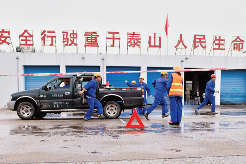 本報記者 王國梁 魯明強(qiáng) 張志遠(yuǎn) 8月20日,細(xì)雨霏霏。 上午九時許,地處市南郊田村的忻州泉鑫公司,“開始!”隨著演練總指揮一聲令下,鳴著警笛的消防車呼嘯而至駛?cè)刖湮恢?,只見?shù)名身著紅色消防服的消防隊員迅捷下車,熟練地“接”“拉”“噴”,碩大的水柱瞬間噴涌而出,射向演習(xí)假定的高溫油罐車,頓時水霧迷漫,氣團(tuán)飄移……數(shù)分鐘后,“危情警報”解除。這是全市首次危貨道路運(yùn)輸交通戰(zhàn)備應(yīng)急救援演練科目中的一幕。 “演練的意義就在于實戰(zhàn),最忌諱走形式,演為練,練為戰(zhàn),備為患,努力發(fā)揮市直危貨企業(yè)的引領(lǐng)作用,確保全市道路運(yùn)輸安全。”忻州市市直運(yùn)管所負(fù)責(zé)人這樣詮釋應(yīng)急演練。