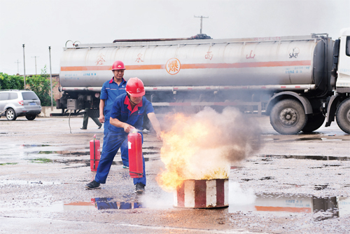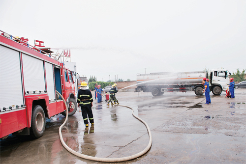 忻州泉鑫公司演練消防滅火。 首先上場的是泉鑫石油運(yùn)輸有限公司,他們演練的科目是汽柴油滅火救援。其一是假定油罐車在缷油時發(fā)生燃燒事故,接到報警后,消防車迅速趕到現(xiàn)場,連接好水槍做好滅火準(zhǔn)備;應(yīng)急搶險隊、車輛搶救隊、后勤保障隊也同時到達(dá)現(xiàn)場,拉起警戒繩,各司其職進(jìn)行應(yīng)急處置,成功將險情排除并清理現(xiàn)場。其二是油罐車在裝油時發(fā)生進(jìn)油口著火險情,各隊?wèi)?yīng)急救援人馬接到警情急速趕到事發(fā)現(xiàn)場,放好三角警示架、拉起警戒繩禁止無關(guān)人員靠近,用消防車水槍對油罐車車體進(jìn)行冷卻處理,利用干粉滅火和石棉滅火等技法,最終成功處置險情。