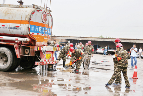 第三家上場的是安通危貨運(yùn)輸有限公司,他們演練的科目是液堿泄露處置。假定裝載液堿的危貨車行駛中發(fā)生泄露后,駕駛員和押運(yùn)員現(xiàn)場采取緊急措施,并請求公司火速救援。公司應(yīng)急救援組立即啟動(dòng)應(yīng)急預(yù)案,并向火警119、保險(xiǎn)公司報(bào)案。環(huán)境監(jiān)測組、現(xiàn)場救援組、事故現(xiàn)場警戒和人員疏散組、事故調(diào)查組立即到達(dá)現(xiàn)場分頭展開工作,泄漏液堿最終處置完畢,避免了二次事故和次生災(zāi)害的發(fā)生,未造成環(huán)境污染。