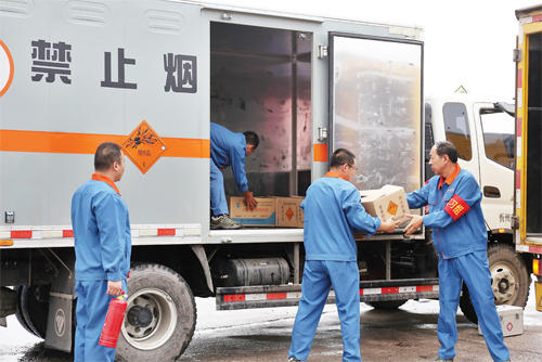 最后上場的是同力運(yùn)輸有限公司,他們演練的科目是民爆用品交通事故應(yīng)急救援。模擬一輛裝載有20箱炸藥的廂式專用貨車被追尾,駕駛員查看現(xiàn)場拍照、報(bào)警,請求救援,押運(yùn)員立即保護(hù)現(xiàn)場避免發(fā)生二次事故。公司第一時(shí)間組織救援人員和車輛到達(dá)事發(fā)地,將事故車上的炸藥輕拿輕放搬移到前來救援的一輛廂式貨車上。炸藥運(yùn)走后,險(xiǎn)情排除,事故現(xiàn)場等待交警處理,進(jìn)入交通事故處理程序。