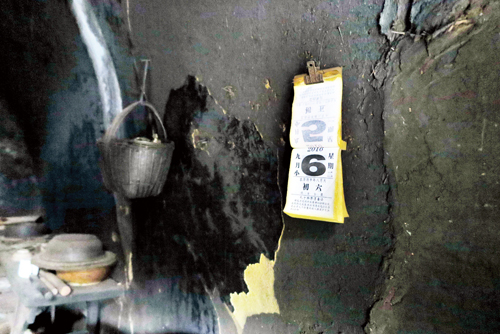 黑漆漆的窯洞里盤著一鋪大炕,炕上堆著看不出本色的被褥;有一處做飯的鍋灶和布滿灰塵的瓷甕、瓷缸、碗筷瓢盆,還有一個早已掉光了油漆的躺柜,窯洞的四壁被經(jīng)年的煙塵熏成炭黑色。屋里沒有電燈電視,唯一有點現(xiàn)代氣息的東西,就是懸掛在墻上的“月份牌子”。