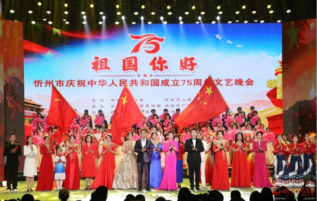 晚會(huì)分“祖國頌歌”“美麗家園”“擁抱未來”三個(gè)篇章,在飽含深情的歌舞表演《今天是你的生日》中拉開序幕。隨后,北路梆子《繡紅旗》選段、合唱《我的祖國》《祖國頌》、詩朗誦《忻州在強(qiáng)國道路上迅跑》、少兒合唱《我們是共產(chǎn)主義接班人》、舞蹈《我和我的祖國》《在中國大地上》《江山》、歌舞《在希望的田野上》《奮進(jìn)新時(shí)代》等節(jié)目接連上演,將現(xiàn)場氛圍推向高潮,贏得臺(tái)下觀眾陣陣掌聲。最后全體觀眾起立,與所有演員合唱《歌唱祖國》,雄壯的歌聲、真摯的情感將臺(tái)上臺(tái)下融為一體,晚會(huì)在激昂的歌聲中圓滿落下帷幕。