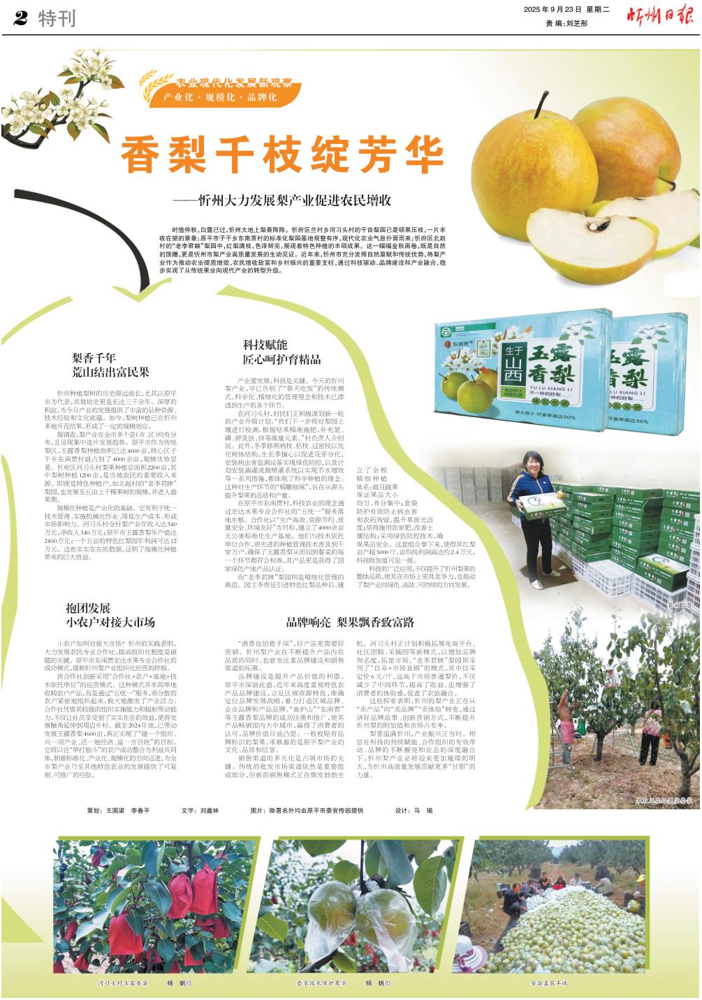 時(shí)值仲秋,白露已過(guò),忻州大地上梨香陣陣。忻府區(qū)蘭村鄉(xiāng)河習(xí)頭村的千畝梨園已是碩果壓枝,一片豐收在望的景象;原平市子干鄉(xiāng)東南賈村的標(biāo)準(zhǔn)化梨園基地規(guī)整有序,現(xiàn)代化農(nóng)業(yè)氣息撲面而來(lái);忻府區(qū)北趙村的“老李君睞”梨園中,紅梨滿(mǎn)枝,色澤鮮亮,展現(xiàn)著特色種植的豐碩成果。這一幅幅金秋畫(huà)卷,既是自然的饋贈(zèng),更是忻州市梨產(chǎn)業(yè)高質(zhì)量發(fā)展的生動(dòng)見(jiàn)證。近年來(lái),忻州市充分發(fā)揮自然稟賦和傳統(tǒng)優(yōu)勢(shì),將梨產(chǎn)業(yè)作為推動(dòng)農(nóng)業(yè)提質(zhì)增效、農(nóng)民增收致富和鄉(xiāng)村振興的重要支柱,通過(guò)科技驅(qū)動(dòng)、品牌建設(shè)和產(chǎn)業(yè)融合,穩(wěn)步實(shí)現(xiàn)了從傳統(tǒng)果業(yè)向現(xiàn)代產(chǎn)業(yè)的轉(zhuǎn)型升級(jí)。