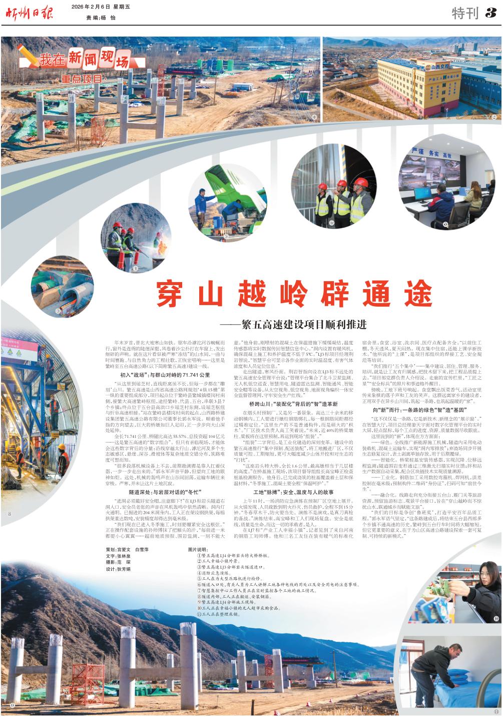 年末歲首,晉北大地寒山如鐵。驅(qū)車沿滹沱河谷蜿蜒而行,窗外是連綿的陡崖深壑,風(fēng)卷著沙塵撲打在車窗上,發(fā)出細(xì)碎的聲響。就在這片看似被嚴(yán)寒“凍結(jié)”的山水間,一曲與時(shí)間賽跑、與自然角力的工程壯歌,正恢宏唱響——這里是繁峙至五臺高速公路(以下簡稱繁五高速)建設(shè)一線。 初入“戰(zhàn)場”:與群山對峙的71.741公里 “從這里到瑤芝村,直線距離雖不長,但每一步都在‘雕刻’山川。繁五高速是山西省高速公路網(wǎng)規(guī)劃‘4縱15橫’第一縱的重要組成部分,項(xiàng)目起點(diǎn)位于繁峙縣繁城鎮(zhèn)樓崗村南側(cè),接繁大高速繁峙樞紐,途經(jīng)繁峙、代縣、五臺,串聯(lián)3縣7個(gè)鄉(xiāng)鎮(zhèn);終點(diǎn)位于五臺縣高洪口鄉(xiāng)瑤芝村東側(cè),設(shè)瑤芝樞紐與忻阜高速相接?!闭驹诜敝趴h樓崗村南的起點(diǎn),山西路橋建設(shè)集團(tuán)繁五高速公路有限公司董事長郭永軍說。順著他手指的方向望去,巨大的橋墩如巨人足印,正一步步向大山深處延伸。 全長71.741公里、橋隧比高達(dá)55.57%、總投資超104億元——這是繁五高速的“數(shù)字組合”。但只有親臨現(xiàn)場,才能體會這些數(shù)字背后的分量:沿線穿越太行山、滹沱河及多個(gè)生態(tài)敏感區(qū),懸崖、深谷、滑坡體等復(fù)雜地質(zhì)交錯(cuò)分布,筑路難度可想而知。 “很多段落機(jī)械設(shè)備上不去,前期勘測都是靠人扛著儀器,一步一步走出來的。”郭永軍聲音平靜,但望向工地的眼神如炬。遠(yuǎn)處,機(jī)械的轟鳴聲在山谷間回蕩,運(yùn)輸車輛往來穿梭。嚴(yán)寒,并未讓這片土地沉寂。 隧道深處:與巖層對話的“冬忙” “進(jìn)洞必須戴好安全帽,注意腳下!”在LJ3標(biāo)巖頭隧道右洞入口,安全員老張的聲音在風(fēng)機(jī)轟鳴中依然清晰。洞內(nèi)燈火通明。已掘進(jìn)的204米洞身內(nèi),工人正在架設(shè)鋼拱架,每榀拱架重達(dá)數(shù)噸,安裝精度卻得達(dá)到毫米級。 “我們現(xiàn)在已進(jìn)入冬季施工,時(shí)刻要繃緊安全這根弦?!闭诓僮髋涮自O(shè)施的孫師傅抹了把額頭的汗,“每前進(jìn)一米都要小心翼翼——超前地質(zhì)預(yù)報(bào)、圍巖監(jiān)測,一刻不能大意?!彼砬埃瑒倗娚涞幕炷猎诒卮胧┫戮従從Y(jié),溫度傳感器將實(shí)時(shí)數(shù)據(jù)傳回智慧信息中心?!岸磧?nèi)設(shè)置有暖風(fēng)機(jī),確?;炷潦┕ず宛B(yǎng)護(hù)溫度不低于5℃?!盠J3標(biāo)項(xiàng)目經(jīng)理荊巖智說,“智慧平臺可顯示各作業(yè)面的實(shí)時(shí)溫濕度、有害氣體濃度和人員定位信息?!?/p> 走出隧道,寒風(fēng)撲面。荊巖智指向設(shè)在LJ3標(biāo)不遠(yuǎn)處的繁五高速安全管理平臺說:“管理平臺集合了北斗衛(wèi)星監(jiān)測、無人機(jī)低空巡查、智慧用電、隧道雷達(dá)監(jiān)測、智能通風(fēng)、智能安全帽等設(shè)備,從太空視角、低空視角、地面視角編織一體安全監(jiān)督管理網(wǎng),守牢安全生產(chǎn)紅線?!?/p> 橋跨山川:“裝配化”背后的“智”造革新 在煙頭村預(yù)制廠,又是另一番景象。高達(dá)三十余米的移動(dòng)鋼模內(nèi),工人要進(jìn)行墩柱鋼筋綁扎,每一根鋼筋間距都經(jīng)過精準(zhǔn)定位?!斑@里生產(chǎn)的不是普通構(gòu)件,而是碩大的‘積木’。”廠區(qū)技術(shù)負(fù)責(zé)人高工笑著說,“未來,近40%的橋梁墩柱、梁板將在這里預(yù)制,再運(yùn)到現(xiàn)場‘組裝’?!?/p> “組裝”二字背后,是工業(yè)化建造的深刻變革。建設(shè)中的繁五高速推行“集中預(yù)制、配送裝配”,將工地搬進(jìn)廠區(qū),不僅質(zhì)量可控、工期縮短,更可大幅度減少山體開挖和對生態(tài)的“打擾”。 “這座巖頭特大橋,全長1.6公里,最高墩相當(dāng)于幾層樓的高度。”在橋基施工現(xiàn)場,該項(xiàng)目督導(dǎo)組組長高寶峰正檢查樁基檢測報(bào)告。他身后,已完成澆筑的樁基覆蓋著土層和保溫材料,“冬季施工,混凝土要全程‘保溫呵護(hù)’?!?/p> 工地“脈搏”:安全、溫度與人的故事 上午11時(shí),一場消防應(yīng)急演練在預(yù)制廠區(qū)空地上展開。從火情發(fā)現(xiàn)、人員疏散到明火撲滅、傷員救護(hù),全程不到15分鐘?!岸翰菽靖桑阑鹨?dāng)先。演練不是演戲,是真刀真槍的備戰(zhàn)?!毖菥毥Y(jié)束,高寶峰和工人們現(xiàn)場復(fù)盤。安全是底線,質(zhì)量是生命,而這一切的承載者,是人。 在LJ7標(biāo)“產(chǎn)業(yè)工人幸福小鎮(zhèn)”,記者見到了來自河南的鋼筋工劉師傅。他和三名工友住在裝有暖氣的標(biāo)準(zhǔn)化宿舍里,食堂、浴室、洗衣間、醫(yī)療點(diǎn)配備齊全?!耙郧白」づ?,冬天透風(fēng),夏天悶熱。現(xiàn)在集中住宿,還能上課學(xué)新技術(shù)?!彼f的“上課”,是項(xiàng)目部組織的焊接工藝、安全規(guī)范等培訓(xùn)。 “我們推行‘五個(gè)集中’——集中建設(shè)、居住、管理、服務(wù)、培訓(xùn),就是讓工友有歸屬感,把技術(shù)留下來,把工程品質(zhì)提上去。”項(xiàng)目部黨群負(fù)責(zé)人介紹說。走廊的宣傳欄里,“工匠之星”“安全標(biāo)兵”的照片和事跡格外醒目。 傍晚,工地下班號響起。食堂飄出飯菜香氣,活動(dòng)室里傳來象棋的落子聲和工友的笑聲。這群遠(yuǎn)離家鄉(xiāng)的建設(shè)者,正