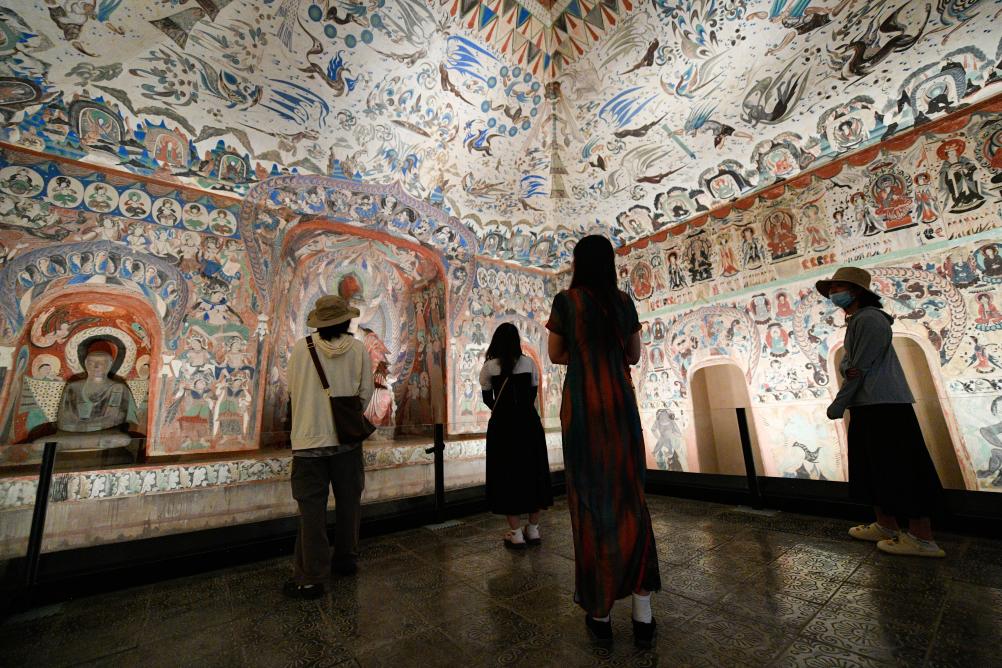 2024年6月7日,在敦煌石窟文物保護研究陳列中心,游客參觀莫高窟復制洞窟第276窟壁畫。新華社記者 郎兵兵 攝 “莫高窟無疑是敦煌最具標志性的瑰寶,這里是世界上現(xiàn)存歷史最悠久、規(guī)模最宏大、內(nèi)容最豐富、保存最完整的佛教藝術(shù)寶庫之一,被譽為‘大漠里的藝術(shù)館’?!碧m州大學敦煌學研究所所長鄭炳林說。