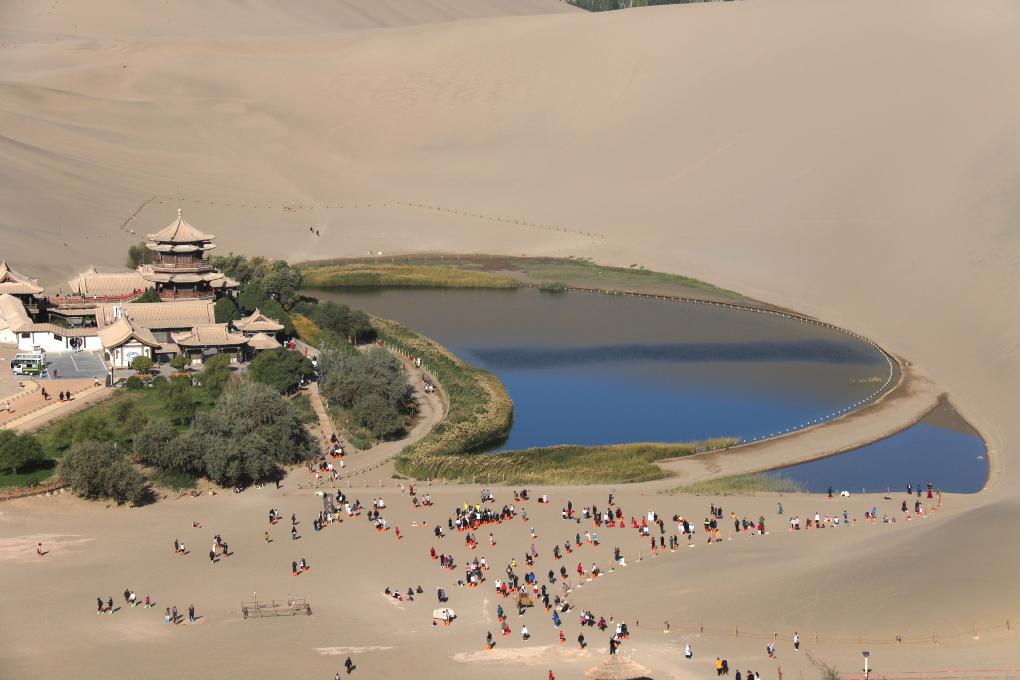 2024年10月3日,游客在甘肅省敦煌市鳴沙山月牙泉景區(qū)游覽。張曉亮 攝 “來一次就會愛上?!?/p> 月牙泉是沙漠的眼睛,依舊倒映著漢唐的明月。駝隊曾經(jīng)從這里經(jīng)過,駝鈴聲串起長安與羅馬的夢。絲綢是流動的彩虹,瓷器是凝固的月光,經(jīng)卷里藏著智慧的種子,在歐亞大陸上生根發(fā)芽。 “在這里游客不僅可以欣賞大漠風光,體驗絲路風情,還可以品味莫高神韻,感悟敦煌文化。”敦煌市文體廣電和旅游局副局長楊紅說。