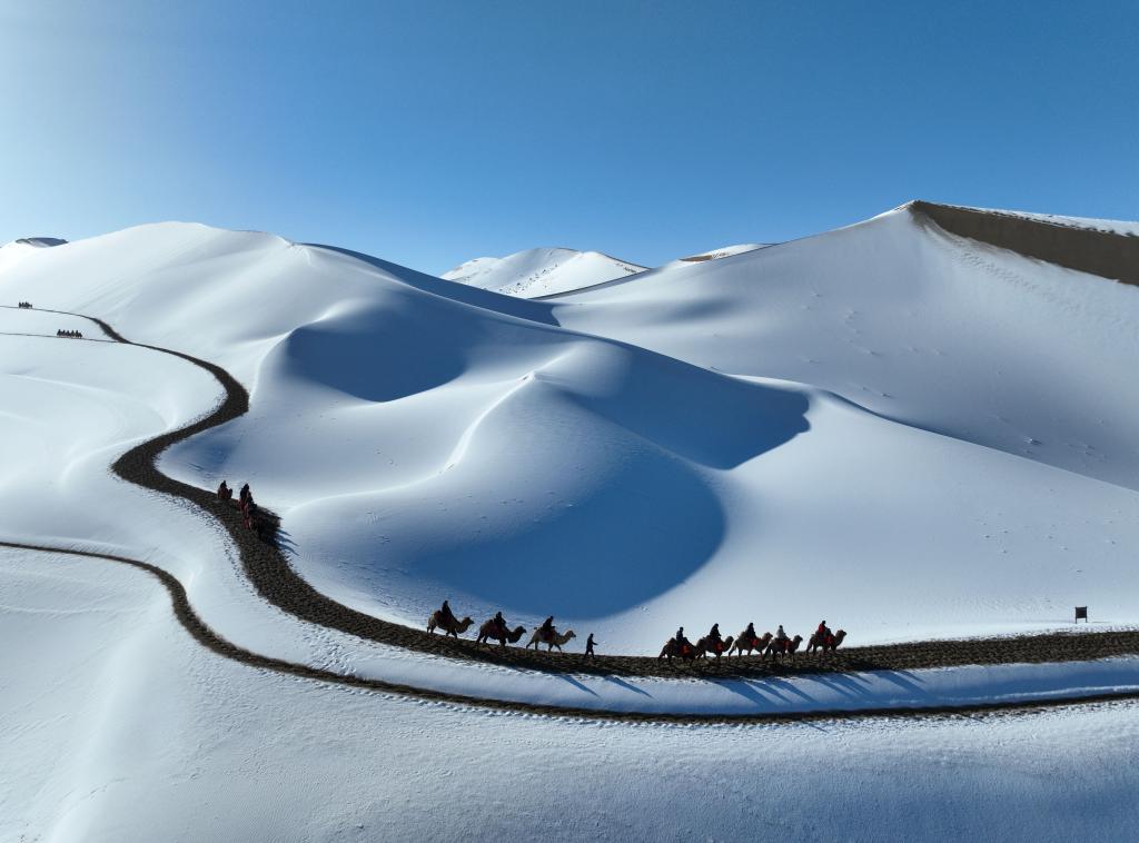2023年11月15日拍攝的甘肅省敦煌市鳴沙山月牙泉景區(qū)雪景。張曉亮 攝 “來一次就會愛上。” 玉門關(guān)外,詩歌的種子早已隨風飄散,在邊塞詩人的筆下開出思念的花。而今,古樸雋秀的城市風貌、香氣撲鼻的特色美食、玲瑯滿目的沙洲夜市、豐富多彩的民俗風情……吟唱的曲調(diào)里,更多了生生不息的希望。