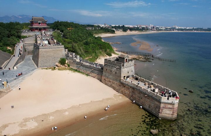 2024年9月19日,游客在秦皇島市山海關(guān)區(qū)老龍頭景區(qū)游覽(無(wú)人機(jī)照片)。新華社記者 楊世堯 攝