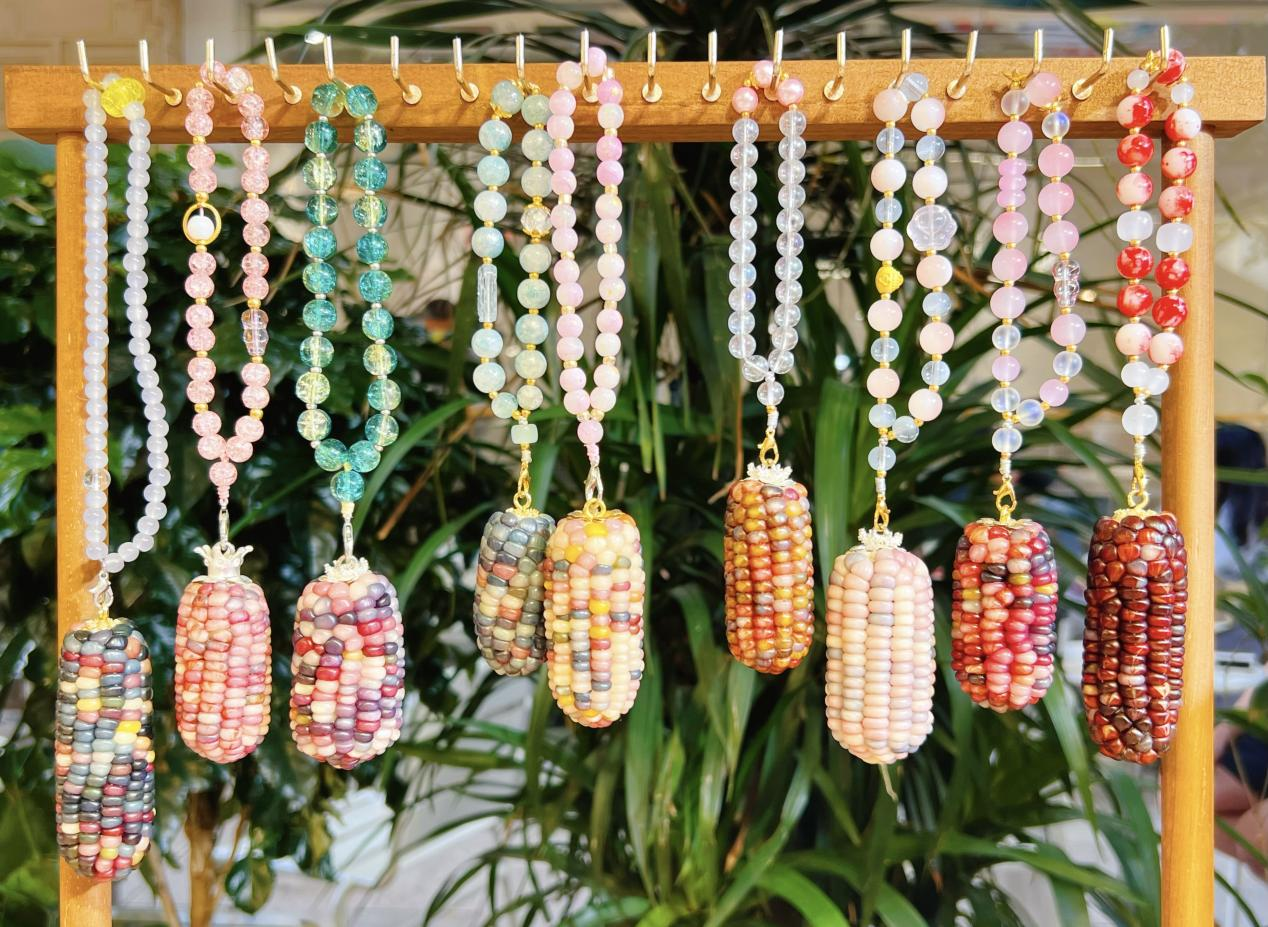 經(jīng)自然晾曬、人工精選、手工創(chuàng)意后,高顏值的玉米迎來了“七十二變”:配上木質(zhì)底座成為文玩擺件,單粒打孔輔以云南銀飾變成手鏈、鑰匙扣,掛飾、裝飾畫等。