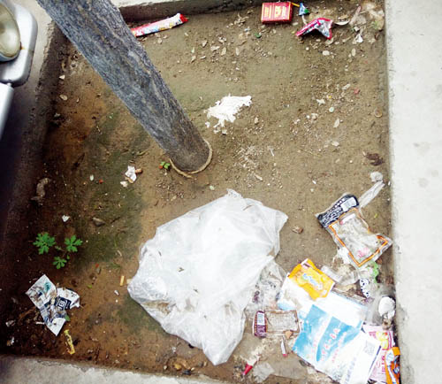 近日,記者在華榮區(qū)發(fā)現(xiàn),路旁的很多樹坑被當(dāng)成了垃圾桶,人們隨手將果皮紙屑塑料袋扔在了里面,影響市容不說也污染了環(huán)境。樹坑內(nèi)垃圾不但難于清理,而且污水滲入土內(nèi)會導(dǎo)致樹木根部和樹皮底部的腐爛。同時,長久被油污浸泡的土地會變成“ 油土”,樹木無法正常呼吸,最終導(dǎo)致死亡。馬路兩旁的行道樹不僅可以凈化空氣、美化市容市貌,在夏天的時候還能給行人提供天然的蔭涼。希望附近的居民能夠管住自己的手,不要再向樹坑內(nèi)扔垃圾,養(yǎng)成愛護(hù)環(huán)境的文明習(xí)慣。實習(xí)記者 王菲 攝