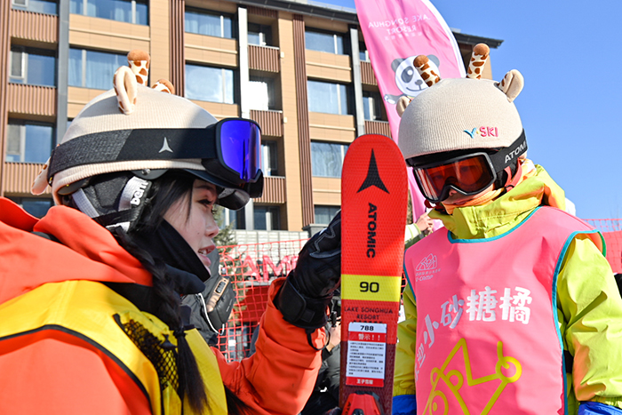 1月8日,滑雪教練在吉林市萬科松花湖度假區(qū)向來自廣西南寧的“砂糖橘”小朋友講解滑雪知識。新華社記者 顏麟蘊 攝