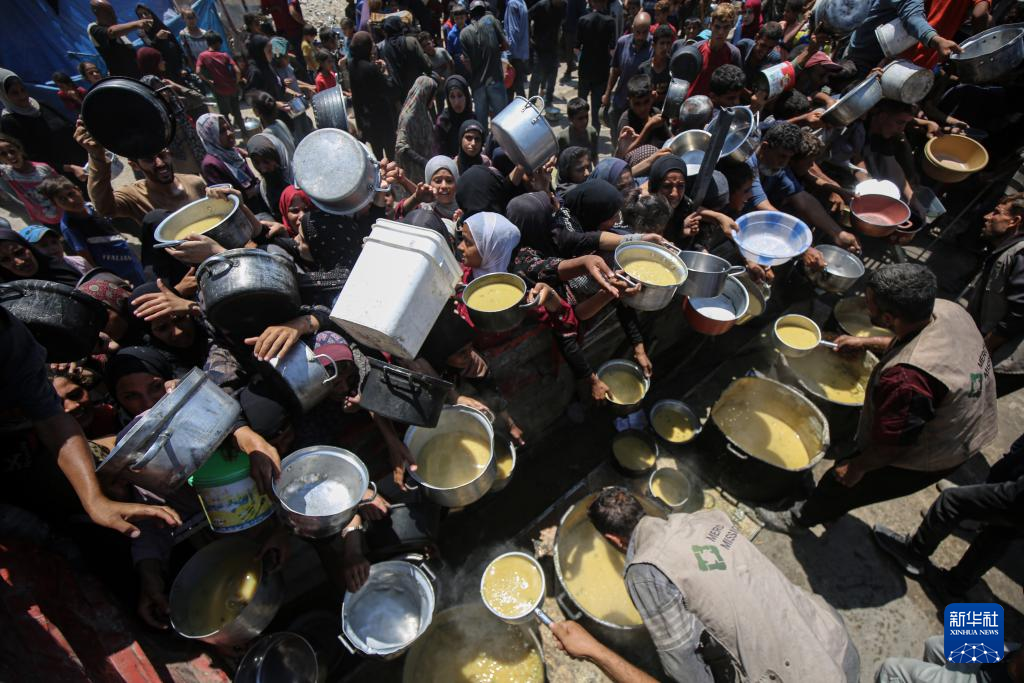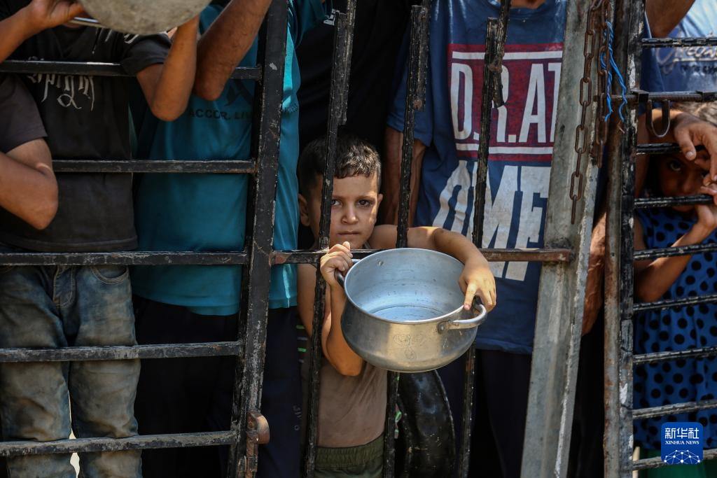 8月2日,流離失所的巴勒斯坦人在加沙城等待領取食物。新華社發(fā)(里澤克·阿卜杜勒賈瓦德攝)