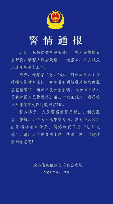 近日,演員謝孟偉(網(wǎng)絡(luò)俗稱“嘎子哥”)在直播帶貨過程中身穿警服,被公安機(jī)關(guān)依法處以行政拘留七日的處罰。該處理結(jié)果獲得輿論普遍支持,體現(xiàn)出社會(huì)對(duì)公權(quán)力象征符號(hào)神圣性的共同維護(hù)。據(jù)通報(bào),謝某在電影拍攝休息期間,身著配有警用標(biāo)志的制式警服公開推銷電子產(chǎn)品,并聲稱“穿警服需通過政審”“公安機(jī)關(guān)應(yīng)當(dāng)配合工作”,企圖利用警服所承載的公信力為其商業(yè)行為背書。