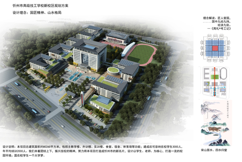 我們本著國(guó)匠精神-九宮格布局、山水格局-背山面水、四水歸堂的設(shè)計(jì)理念,團(tuán)結(jié)上學(xué)、振興技校的精神,努力將本項(xiàng)目打造成為忻州市的新名片,圓技校學(xué)生一個(gè)大學(xué)夢(mèng)。我們注重整體空間的舒適性、藝術(shù)性,不強(qiáng)調(diào)過分統(tǒng)一。設(shè)計(jì)中注重細(xì)節(jié)處理和學(xué)生們行為模式的考慮;將環(huán)境氣氛和設(shè)施布置的更具有靈活性、親和力,適應(yīng)寬松、生活化的教學(xué)模式。