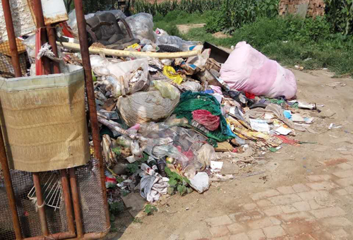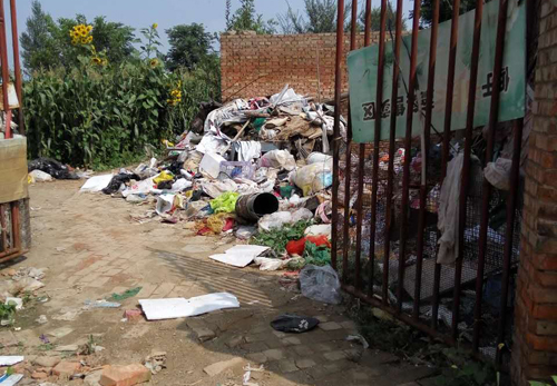 8月2日上午,在村民的陪同下來到匡村村南,在忻州烈士陵園背后一個(gè)叫周家(音)墳的地方,看到路口黑色的玉米桿躺放在井蓋上,生銹的用鋼管焊成的院門兩邊和門口,堆放著五顏六色的塑料袋以及廢塑料和破鐵桶等生活垃圾破爛,連院內(nèi)也同樣是垃圾。