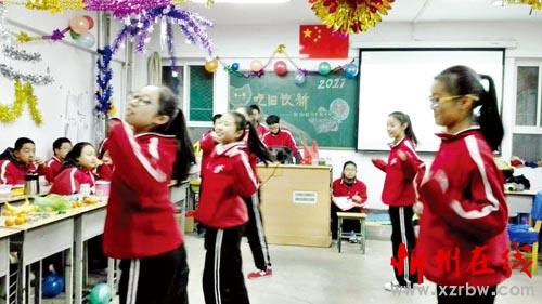 聯(lián)歡會由各班學(xué)生自己精心組織、排練,并由學(xué)生自主開展。同學(xué)們熱情高漲,積極參與,充分發(fā)揮自己的特長,表演自己最拿手的節(jié)目。每位同學(xué)都積極參與,每個(gè)人都成了“明星大腕”。班級聯(lián)歡會內(nèi)容豐富、精彩紛呈,舞蹈、歌曲、相聲、小品、游戲等節(jié)目一一亮相,喜慶祥和的氛圍濃厚強(qiáng)烈。圖為初二210班學(xué)生正在進(jìn)行節(jié)目表演。(郝江峰 攝)