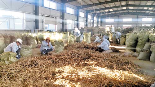 當(dāng)?shù)剞r(nóng)民在產(chǎn)業(yè)孵化園倉(cāng)房?jī)?nèi)分揀黃芪藥材