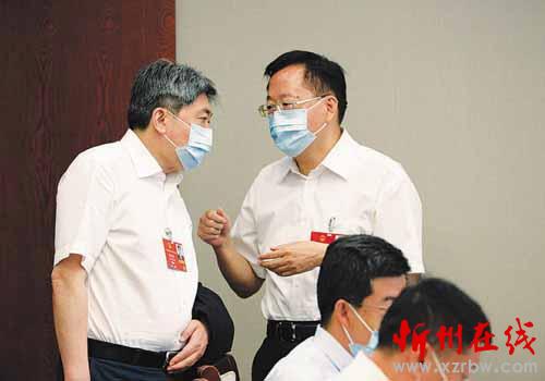 圖為忻州市長朱曉東代表(左)和劉予強代表在交流。